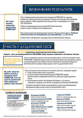 Інформацію про результати ЄВІ та ЄФВВ буде розміщено на інформаційних сторінках «Кабінет учасника вступних випробувань до магістратури» не пізніше 25.07.2023 (для учасників основної сесії) , та не пізніше 18.08.2023 (для учасників додаткової сесії).
