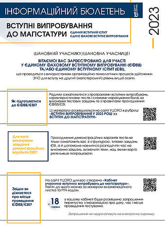 До 18.06.2023 на інформаційній сторінці «Кабінет учасника вступних випробувань до магістратури» буде розміщено інформацію про дату, час і місце проведення тестування.